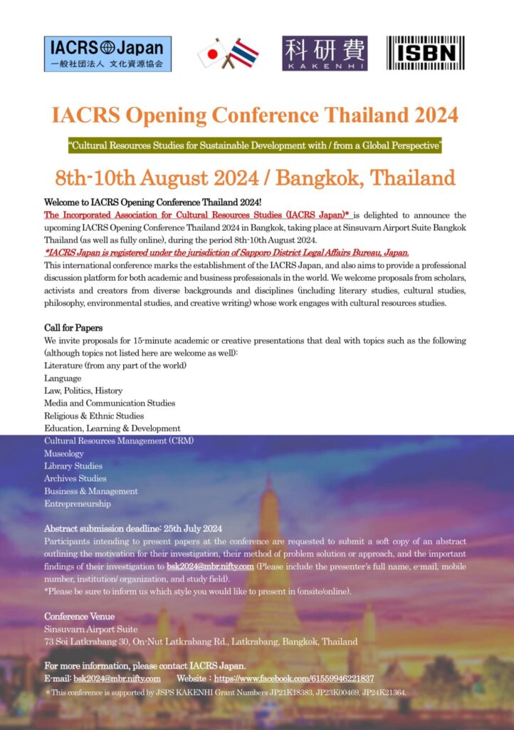 The Incorporated Association for Cultural Resources Studies (IACRS Japan)* is delighted to announce the upcoming 4th IACRS Conference Thailand in Bangkok, taking place at Sinsuvarn Airport Suite Bangkok Thailand (as well as fully online), during the period 6-7 March 2026.